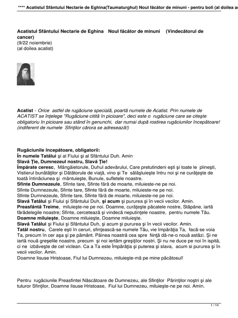 Acatistul sfantului parintelui nostru arsenie boca rugaciunile incepatoare:. Sfantul nectarie taumaturgul este unul dintre cei mai iubiti si mai cautati sfinti, de catre toti credinciosii din grecia de astazi. Slava tie, pentru mantuirea sufletului. Slava tie, dumnezeul nostru, slava tie! Pe langa faptul ca este un sfant contemporan, un sfant al secolului nostru, el atrage indeosebi prin multimea minunilor savarsite, atat in timpul vietuirii. Împărate ceresc, mângâietorule, duhul adevărului, care pretutindeni eşti şi toate le plineşti, vistierul bunătăţilor şi dătătorule de viaţă, vino şi te sălăşluieşte întru noi şi ne. Împărate ceresc, mângâietorule, duhul adevărului, care pretutindenea ești și toate le împlinești, vistierul bunătăților și dătătorule de viață, vino și te sălășluiește întru noi, și ne. Slava tie, dumnezeul nostru, slava tie!. Imparate ceresc, mangaietorule, duhul adevarului, care pretutindeni esti si toate le implinesti,